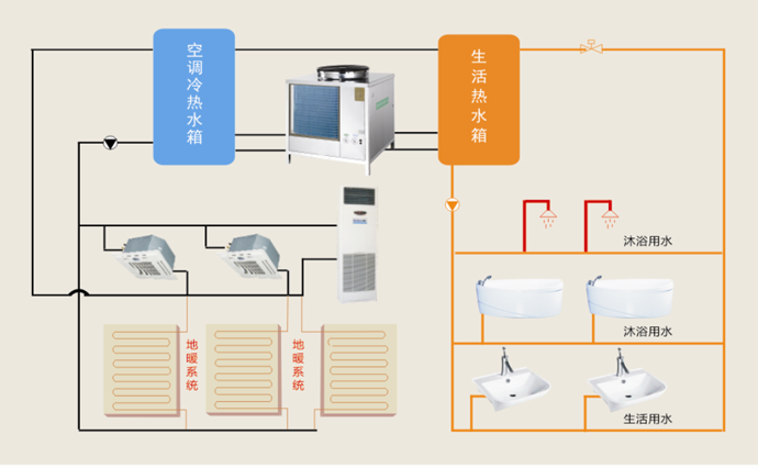 華源空氣能采暖系統,將空氣能熱泵與家用地暖或者風機盤管(立式或者吊頂)相結合,提供所需熱量,另外系統產生的熱水可用于家庭洗浴、生活用熱水的供應,實現冬季采暖與全年熱水供應的結合,建造全套家庭(單位)熱水中心。