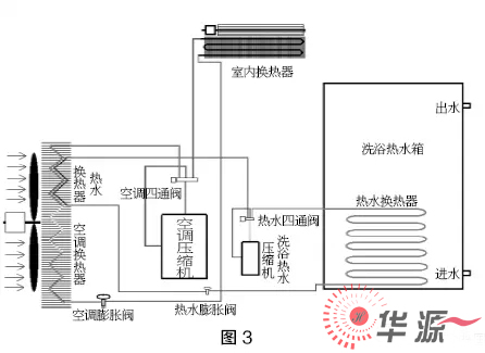 熱泵三聯(lián)供系統(tǒng),概念新穎,所謂空調(diào)模式運(yùn)行時(shí)可以免費(fèi)加熱洗浴熱水,購(gòu)買(mǎi)一套三聯(lián)供設(shè)備,可以實(shí)現(xiàn)室內(nèi)制冷、供暖及洗浴熱水。可以降低部分初投資,但運(yùn)行費(fèi)用與空調(diào)加空氣源熱泵熱水機(jī)的運(yùn)行費(fèi)用是相同的。如下圖2所示: